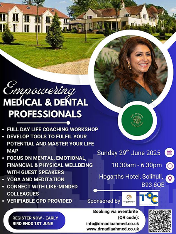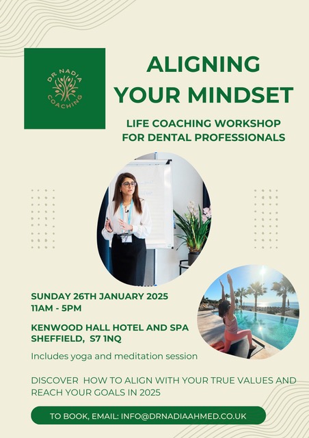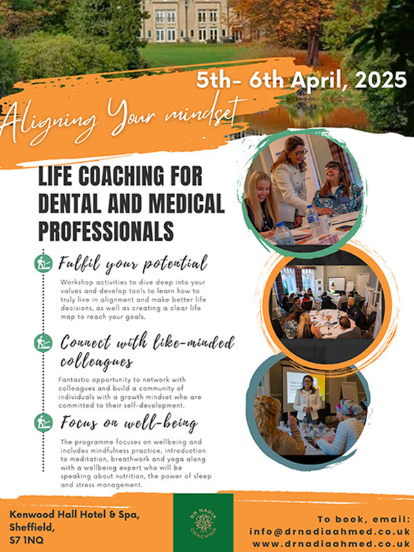 Nadia is a certified life coach as well as a Consultant Orthodontist. She has a passion to support medical and dental professionals in their growth and self-development on their journey to truly live in alignment with their values, fulfil their potential and live their best life. She writes regularly for the BDJ In Practice journal and dentistry online magazine. She also delivers face to face workshops to coach medical and dental professionals.